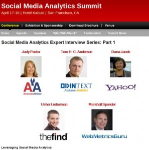 Text Analytics News just published an interesting panel interview on the Social Media Summit website with myself, Dana Jacob who is Sr. Manager of Social Media Insights & Analytics of Yahoo!, Judy Pastor who is Principal Operations Research Manager of American Airlines, Usher Lieberman Director of Corporate Communications at TheFind, and Marshall Sponder of WebMetricsGuru.