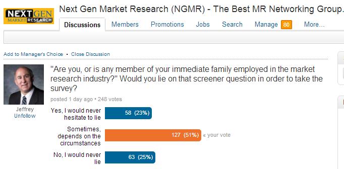 In the Next Gen Market Research group this week the unpopularity of this question became apparent. I postulated that respondents, especially panelists know what this first question is for and will usually answer “none of the above”, and that I believed not even market researchers themselves answer this question truthfully.